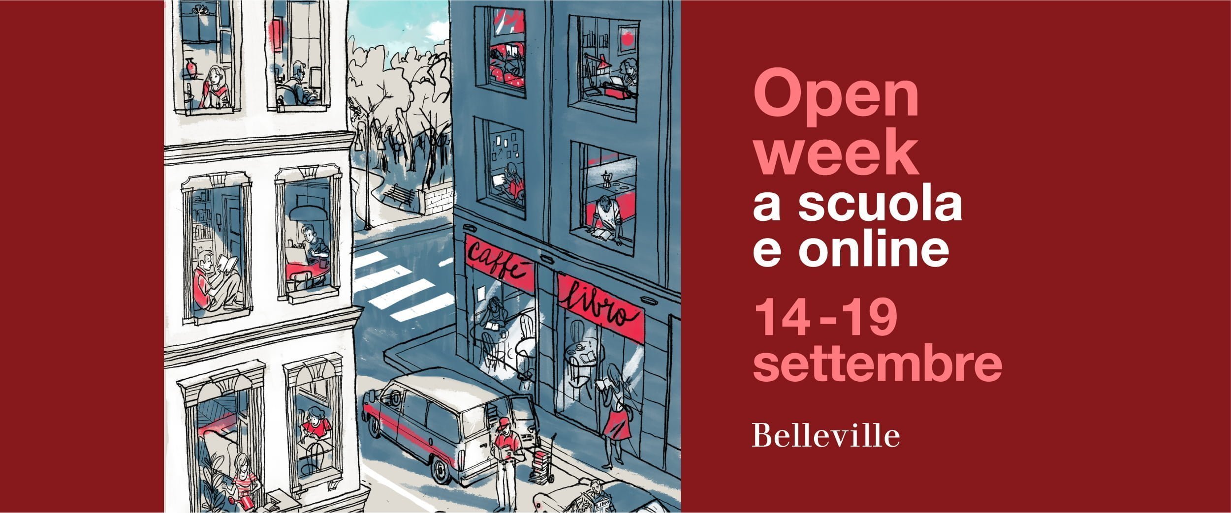 A settembre la Scuola di scrittura Belleville di Milano organizza una settimana di incontri dal vivo e in diretta streaming per presentare i corsi che inizieranno in autunno, conoscere lo staff e incontrare gli insegnanti tra cui Simona Vinci, Marcello Fois, Marco Balzano, Stefano Izzo, Beatrice Masini, Federico Baccomo, Marco Rossari, Ester Armanino, Barbara Gatti, Edoardo Brugnatelli, Matteo Speroni, Gianni Biondillo.