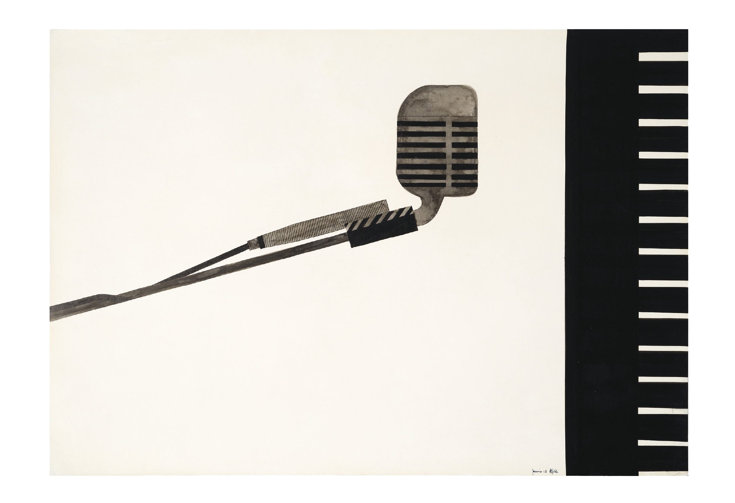 «Del 1965 è la china acquarellata di Alighiero Boetti, di elegante chiarezza compositiva, risalente al periodo torinese prima della sua partenza per Roma nel 1972. Il microfono e la tastiera fanno parte di una serie di carte in bianco e nero dedicata alla fascinazione per il nuovo oggetto domestico tecnologico dall’accurato rigore compositivo.»