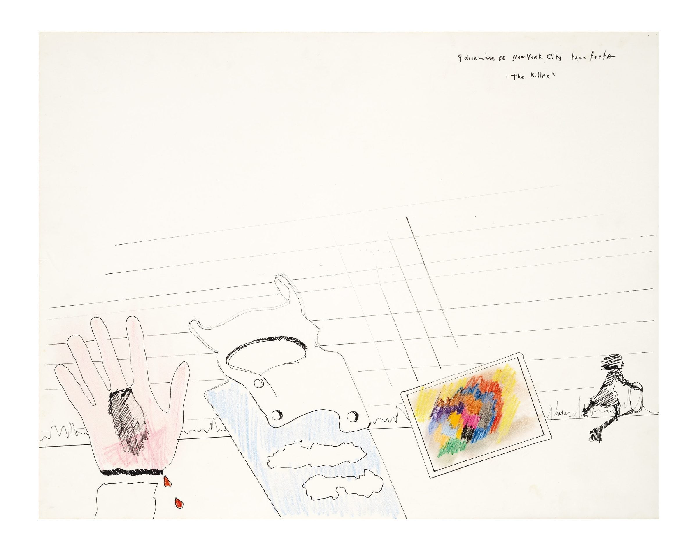 «Del 1966 è il lavoro di Tano Festa The Killer, realizzato durante il suo soggiorno a New York. L’artista riflette sull’eternità di alcune opere della tradizione pittorica italiana, sugli autori che per lui sono maestri senza tempo tra cui De Chirico e Balla. Nel foglio del dicembre passato a New York si possono scorgere elementi ricorrenti come la mano qui mozzata dal polso, su cui è dipinta una seconda mano nera più piccola (omaggio al guanto metafisico di De Chirico) e la ragazzina che corre con il cerchio (da Giacomo Balla). Allo stesso tempo, i riferimenti all’arte americana rimasta negli occhi della mente dell’artista, riemergono nella tavolozza dei colori e nella sega di Jim Dine che accenna già il tema delle nuvole sviluppato poco dopo.»