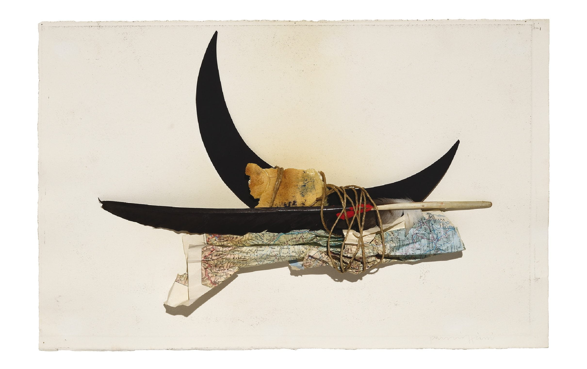 «L’assemblage di Claudio Parmiggiani del 1986 riunisce alcuni elementi cari alla poetica dell’artista: la piantina geografica accartocciata, simbolo delle finte certezze delle scienze fisiche, lo spago, il pezzo di pane, la piuma e lo spicchio di luna nera sono accostati come referenti emotivi del viaggio, condizione del costante divenire dell’essere umano.»