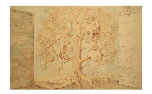 «Presentation of the Characters è letteralmente la presentazione al lettore dei protagonisti dell’unica fiaba scritta e illustrata da Domenico Gnoli in inglese del 1960, intitolata Orestes or the art of Smiling. La carta esprime tutta l’originalità stilistica e l’inventiva già solo a partire dalle scritte sui muri che si aprono come una quinta teatrale da cui fa capolino un intruso sul muro di destra.»